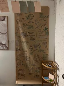 “At first, it can feel overwhelming for someone to commit to be in a prayer room for an hour,” explains Elissa, “but really the time slips away with just a few prompts and leaving space for God to speak.” For example, for one of their prayer weeks they covered the walls with blank paper and some basic prompts, like “confession” and “thanksgiving”. Throughout the week the pages filled with prayers. Anyone could come in and connect with those who had already prayed that week, without needing to know who they were.